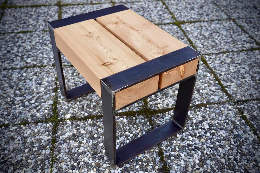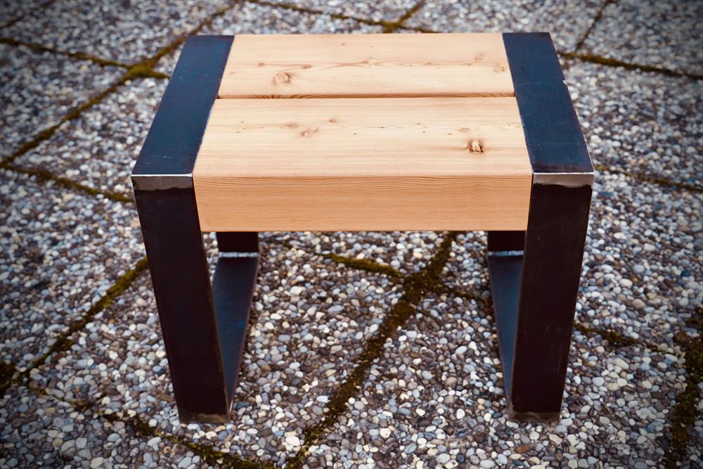 Wenn noch Besuch kommt: Furka gibt es, jetzt auch als Hocker. Einheimisches Lärchenholz und ein handgefertigtes Gestell aus geöltem Rohstahl: Stilvoll, nachhaltig und für langlebigen Komfort geschaffen. Bringen Sie natürliche Eleganz in Ihren Garten oder Innenraum.
